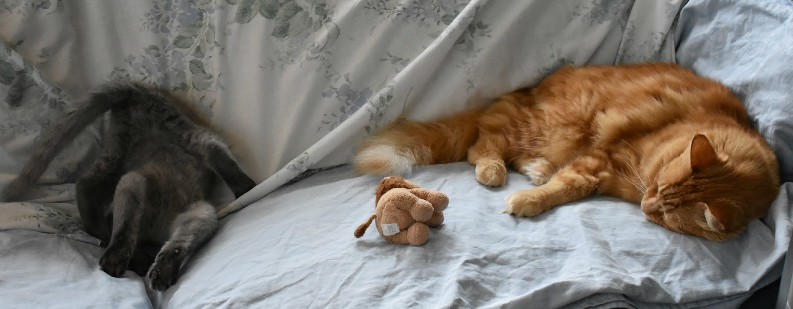 Toby is up on some blankets and Rufus is curled on a lower level;